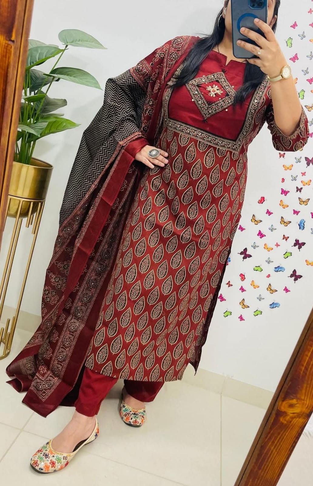 Women Cotton Embroidered Wine Straight kurta 3pc